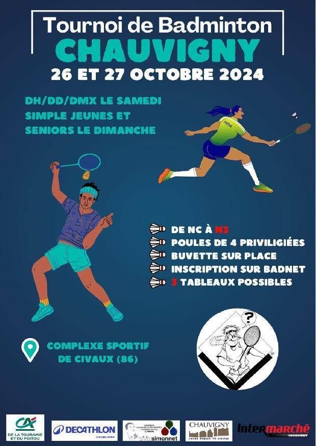 L'US CHAUVIGNY BADMINTON vous accueille pour son tournoi les 26 et 27 Octobre 2024.
